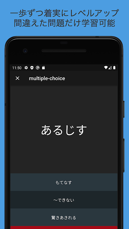ここでは表示された問題に最も適切な答えを3つの選択肢の中から選択します。答えが分からない場合は適当な選択肢をタップするのではなく「分からない」を選ぶようにしてください。約10問が1つのレッスンになっているため、レッスンの問題全てに回答した後、正解を確認することが可能です。