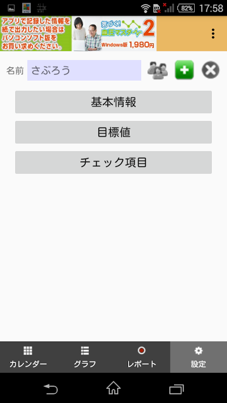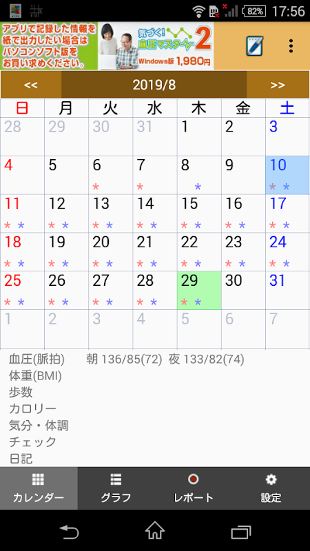本アプリは、毎日測定する血圧や脈拍・体重を楽しく記録し、それをグラフや一覧表に表示できる無料アプリです。また記録したデータをPC版「気づく!血圧マスター2」に移行してプリンターで出力することもできます(ただしPC版は有料です)。