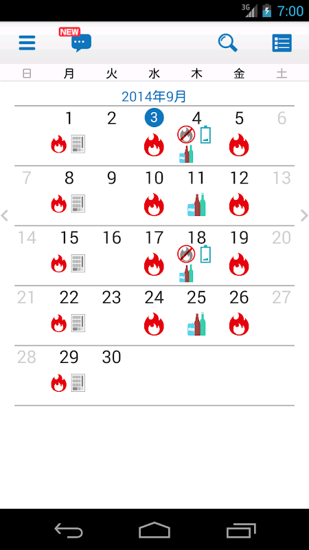 今日と明日、週ごと、月ごとの3パターンによるごみ収集日程を一つの画面ですぐに確認することができます。