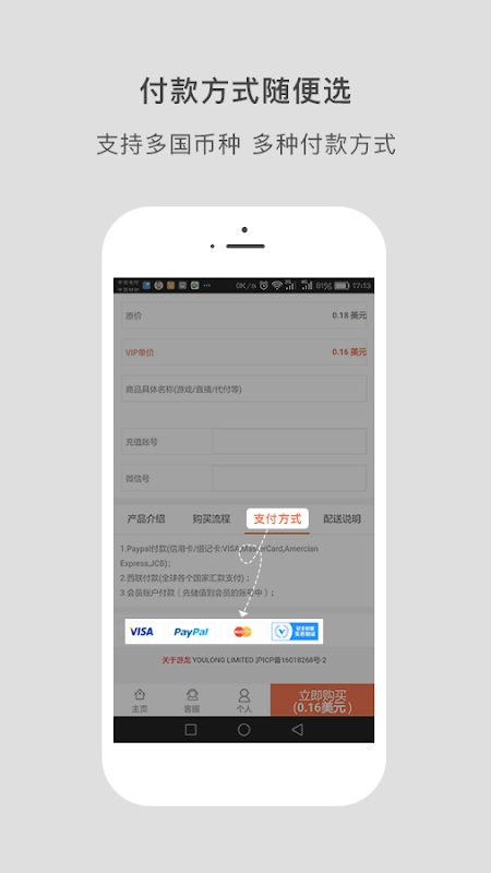 为海外客户充值中国游戏,直播平台,点卡,微信,支付宝,支持VISA MasterCard Paypal付款,24小时服务