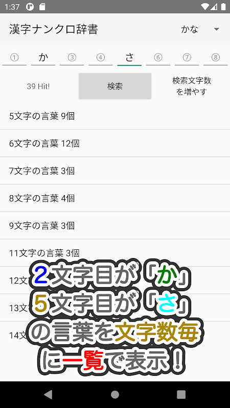 Ini adalah aplikasi kamus yang boleh digunakan untuk menjawab teka-teki Silang Kata Kanji Nankuro / Kanji dan membuat soalan. Watak "Kana" juga disokong untuk digunakan dalam teka-teki silang kata.