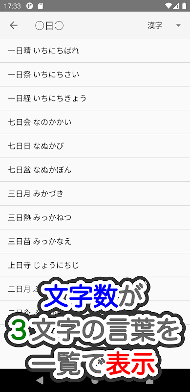 Sekiranya anda mencari perkataan "Ichi" dalam watak pertama dan "Ichi" dalam watak ketiga, senarai seperti "Ichisei Ichidai", "Ichigo Ichikai", dan "Satu kata satu frasa" akan dipaparkan.