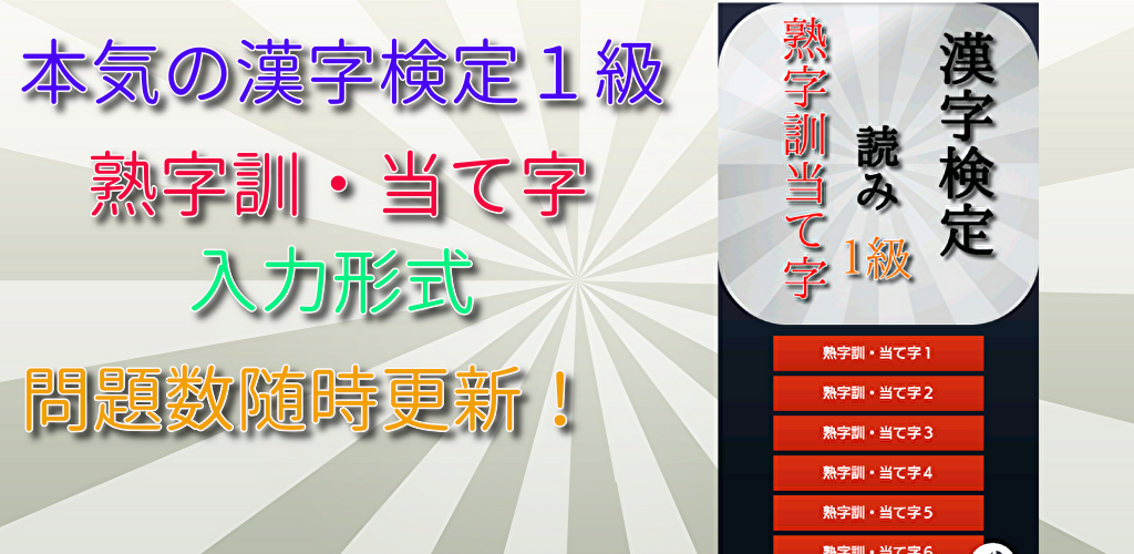It is a problem collection application that mainly puts "jujikun / ateji", which is the first grade of the Kanji Kentei.