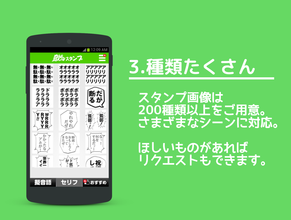 Onomatopoeic stamp "Dododo" and "Gogogo", serif stamp "But refuse" and "Oraoraora"Let's use the chat app that I always use! Stamp app completely free.