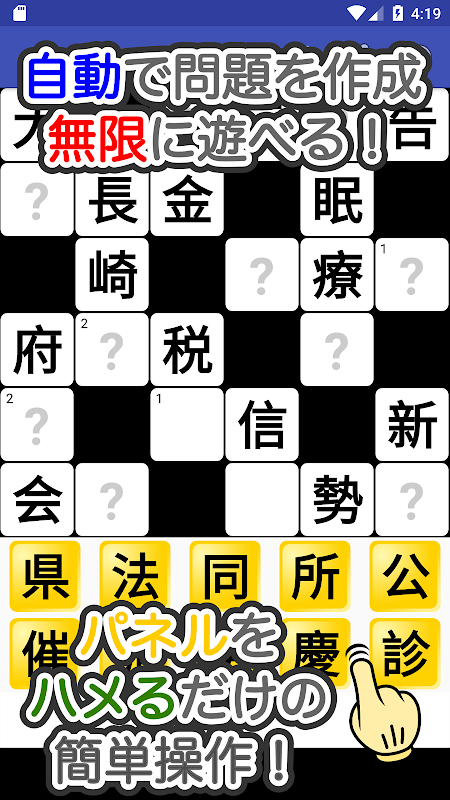 自動で問題を作成! 無限に遊べる漢字埋めクロスワードパズルです。 今までに無かったパズルで、 頭を柔らかくして脳トレにチャレンジ!