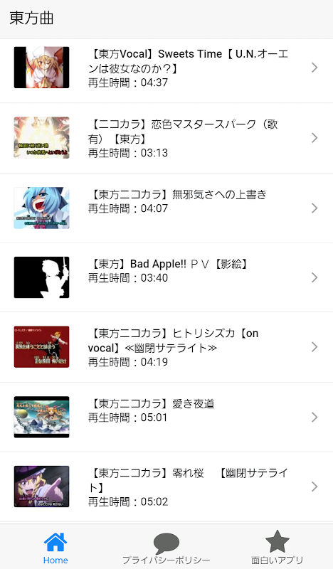 アプリ内の東方&面白アプリに『東方の原曲集アプリ』を追加しました。
