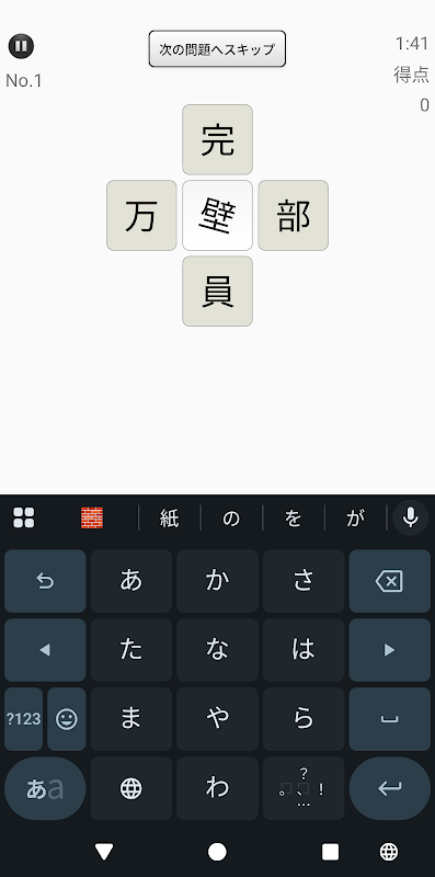 Frasa kanji, nama tempat, nama orang, dsb. dipaparkan di bahagian atas skrin, termasuk petak kosong. Ini ialah permainan di mana elemen utama adalah pengetahuan dan inspirasi untuk melengkapkan perkataan dengan mengetik kanji yang sesuai daripada senarai kanji di bawah.