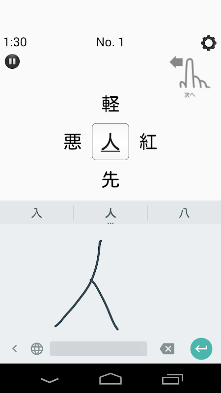 アプリ独自の手書き入力です。キーボードなどの設定はする必要がありません。すぐにゲームを楽しめます。(ただしGoogle手書き入力アプリに比べると認識率は低いです。)当てはまる漢字を画面下のパッド一杯に大きくはっきり手書きしてください。(小さい文字ですと認識率が下がります。)手書き入力を元に20個の漢字が候補として右側のリストに表示されます。その中から該当する漢字をタップします。(指で上下にスライドしていただければ、画面外の漢字も参照できるようになります。)