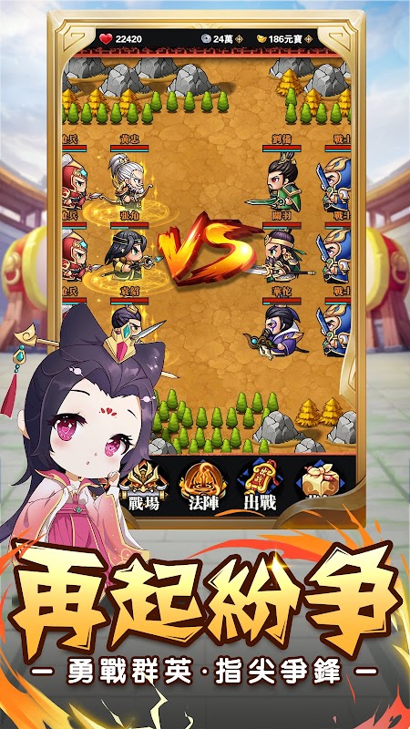 Buat semula permainan tempur berasaskan giliran yang paling klasik. Kali ini anda boleh membawa 5 jeneral berperang pada masa yang sama, dan pergi ke medan perang bersama-sama! Setiap komander tentera mempunyai kemahiran tersendiri. Kombinasi yang munasabah dapat menerima kesan memecahkan musuh dan membalikkan keadaan. Ucapkan selamat tinggal pada pertempuran tanpa otak dan nikmati strategi permainan yang paling menarik!
