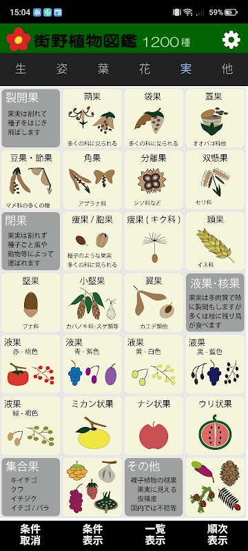 Bar hitam di bahagian atas skrin menunjukkan perkara berikut: Kehidupan (kehidupan), Rupa (rupa), Daun, Bunga, Buah-buahan, Lain-lain.