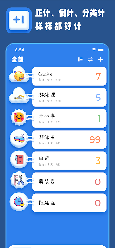 Gunakan senarai untuk menunjukkan kiraan anda untuk setiap kali, semak sejarah "berfungsi" dengan mudah dan rekodkan situasi dan mood pada masa itu melalui log, yang boleh membantu anda merancang tindakan seterusnya anda dengan lebih baik.