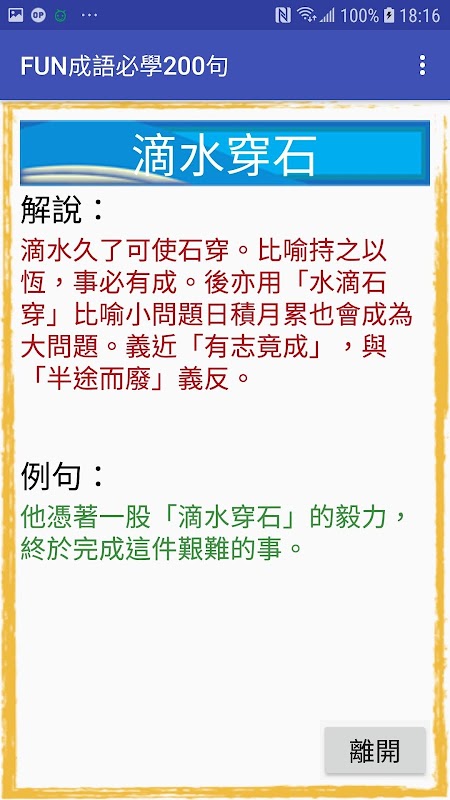 APLIKASI ini mengandungi lebih daripada 200 simpulan bahasa yang sesuai untuk sekolah rendah dan menengah (200 simpulan bahasa untuk simpulan bahasa sekolah rendah di Tainan, Taiwan). Idiom ini disampaikan dengan cara yang sistematik, jelas, dan menarik. Ini adalah platform bagi pelajar sekolah rendah dan menengah untuk belajar dan menggunakan simpulan bahasa secara fleksibel. Sistem ini terdiri daripada dua bahagian, satu adalah mempelajari simpulan bahasa, sehingga pelajar dapat memperoleh konsep dasar idiom, dan yang lain adalah bermain simpulan bahasa, dan menggunakan simpulan bahasa untuk belajar dan digunakan dalam kehidupan seharian.