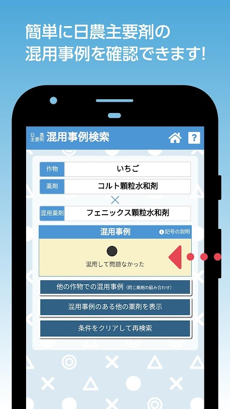 Ini adalah fungsi yang membolehkan anda memeriksa kes penggunaan campuran racun perosak utama Jepun (sama ada terdapat masalah dengan pencampuran, sama ada terdapat masalah, sama ada tidak ada masalah jika keadaan diperhatikan, dll.).