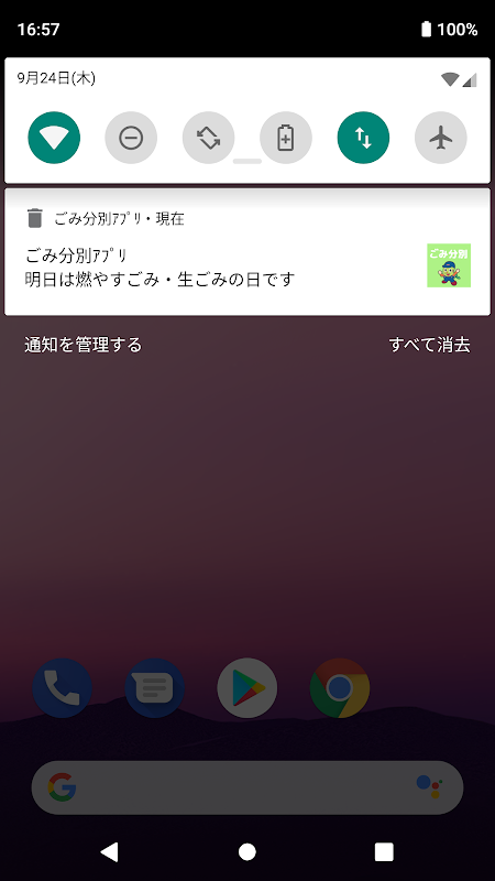 収集予定のごみ種別を前日と当日にアラートでお知らせします。時間は自由に設定することができます。
