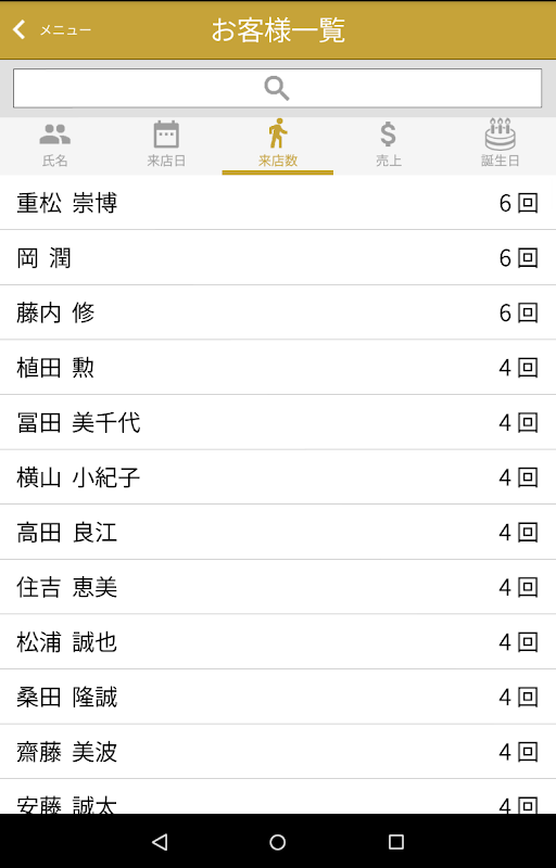 初回来店日、前回来店日、名前、誕生日、電話番号、メールアドレス、来店動機、職業、その他メモを管理