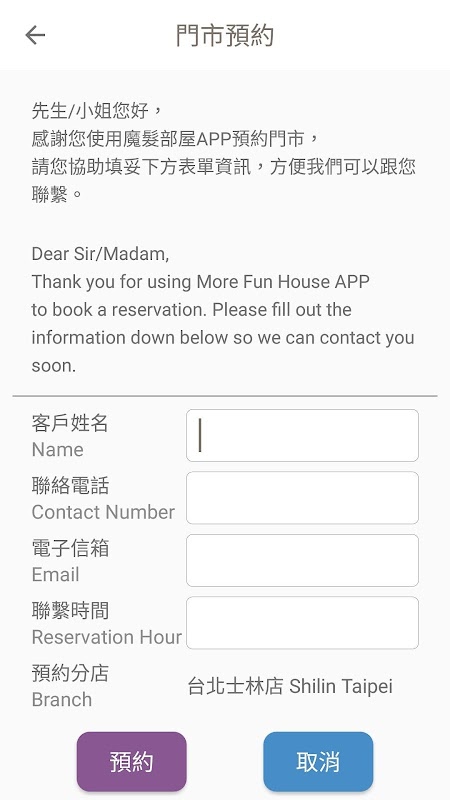 Selain itu, anda boleh membuat tempahan dengan APP kepada mana-mana More Fun House salun di Taiwan.