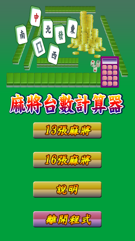 十三張和十六張麻將,不同的牌色有不同的台數,讓人很難全記住,本程式不只列出所有胡牌牌色,另外還計算出所贏金額,最重要的一點還有牌色說明,簡直也可算是麻將字典。