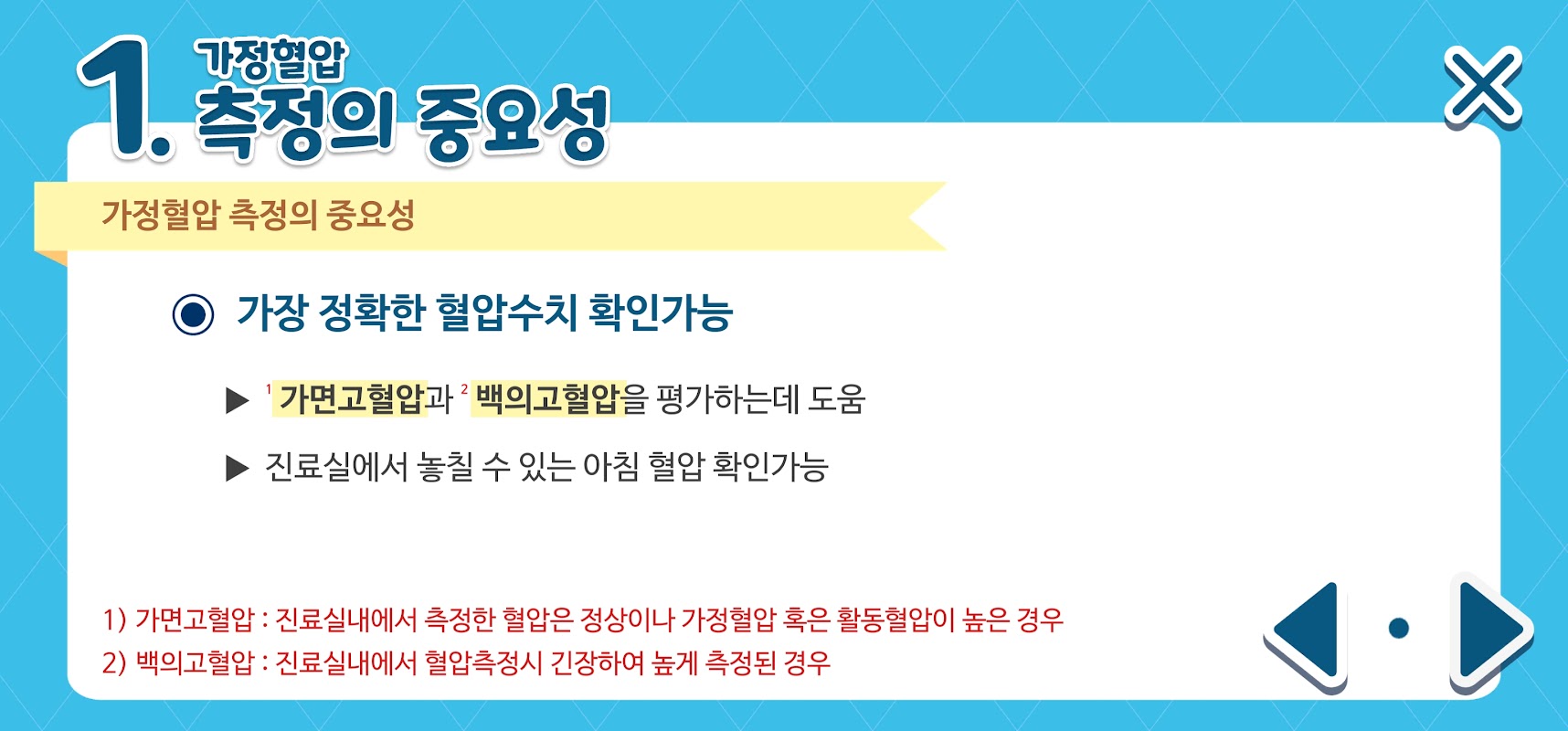 Kerana tekanan darah berubah setiap kali ia diukur, bergantung pada masa dan keadaan sekeliling, adalah penting untuk mengetahui tahap tekanan darah yang tepat untuk menguruskan tekanan darah tinggi. Di samping itu, adalah penting untuk menguruskan tekanan darah tinggi dengan berunding dengan doktor dengan bacaan tekanan darah yang diukur di rumah dengan monitor tekanan darah di rumah dan direkodkan. Untuk tujuan ini, kami mencipta "Kandungan untuk mengukur tekanan darah di rumah" supaya penduduk Chungcheongnam-do boleh mempelajari kepentingan dan kaedah mengukur tekanan darah di rumah untuk diagnosis dan pengurusan tekanan darah tinggi yang betul.