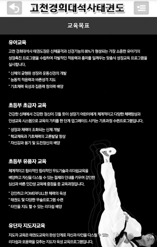 저희 고천 경희대석사 태권도장은 올바른 인성 및 강인한 체력, 전인 육성의 교육이념을 새시대 선진화의 주역으로 성장하게 될