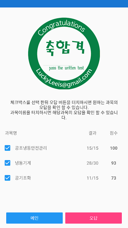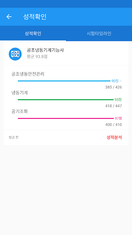 성적확인 - 각 과목별 성적 및 그동안 풀어본 기출문제와 모의고사, 문제풀기의 성적을 볼 수 있습니다.