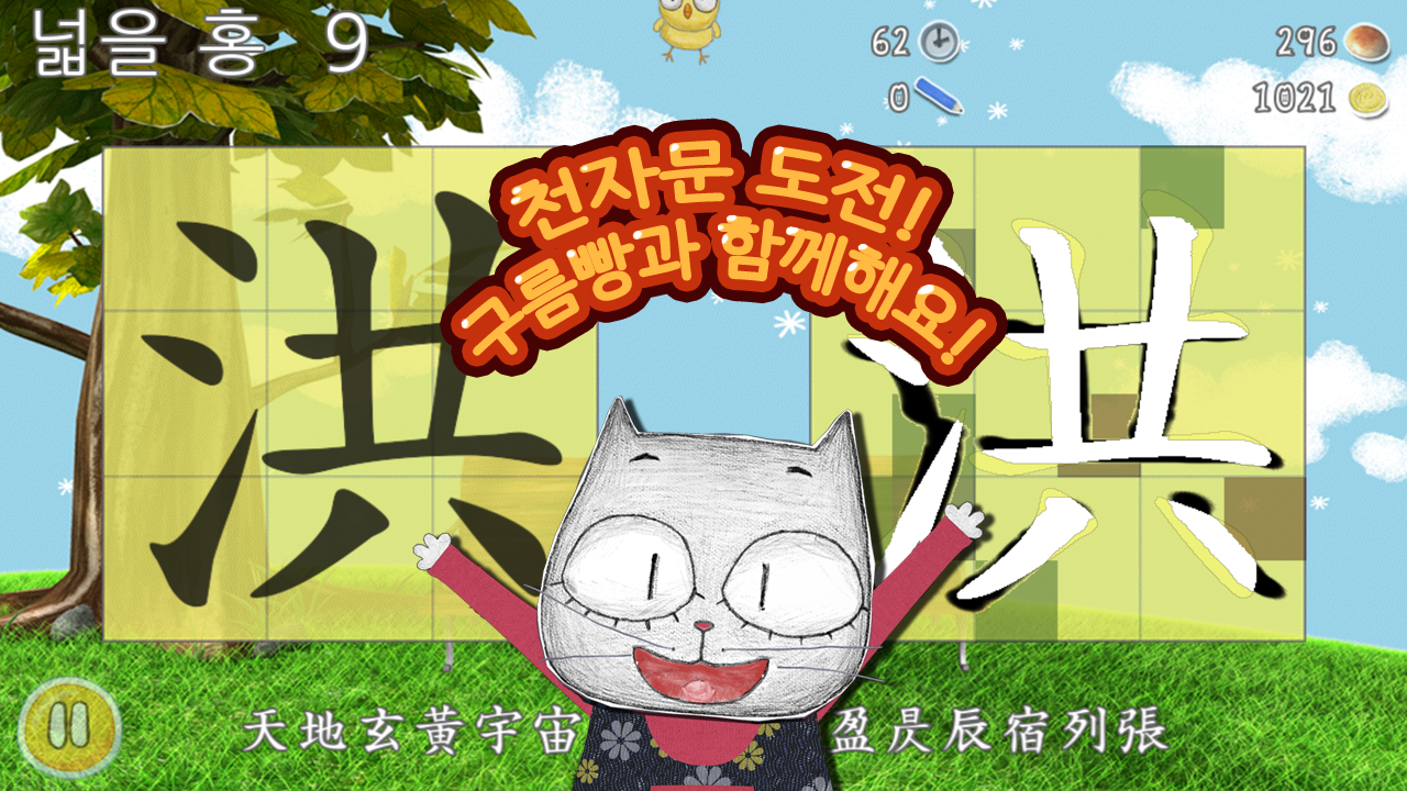 아동 교육용으로 적합하고 친숙한 구름빵 캐릭터를 활용하여 천자문을 (쓰고,보고,형태를 익히고, 맞추기) 게임을 통해서 천자문 한자를 학습하는 기능성 게임 입니다.