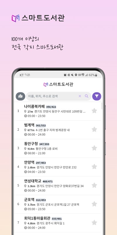 - 위치 : 현재 위치를 기반으로 가까운 스마트도서관 위치를 알려주는 서비스를 제공합니다