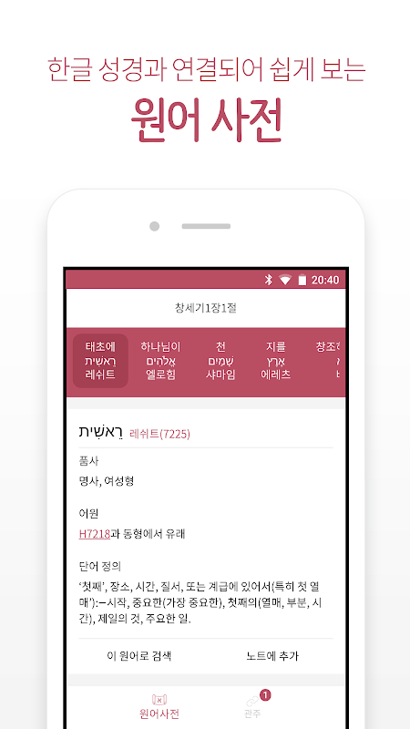 Ibrani Perjanjian Lama BHS (Biblia Hebraica Stuttgartensia, edisi kelima disemak semula, di-app pembelian), Westminster Leningrad Codex (percuma) huruf a, Greek stesen baru Kitab NA28 (Nestle-Aland, Novum Testamentum Graece, Edisi ke-28, di-app pembelian) SBL Greek Perjanjian Baru telah dimasukkan adalah percuma. Khususnya, BHS dan NA28 adalah termasuk dalam penguraian Hangul asal (penguraian tatabahasa, Alkitab berbeza Hangul, Hangul racun) ciri adalah sangat berguna untuk kajian Alkitab dan penyediaan khutbah.