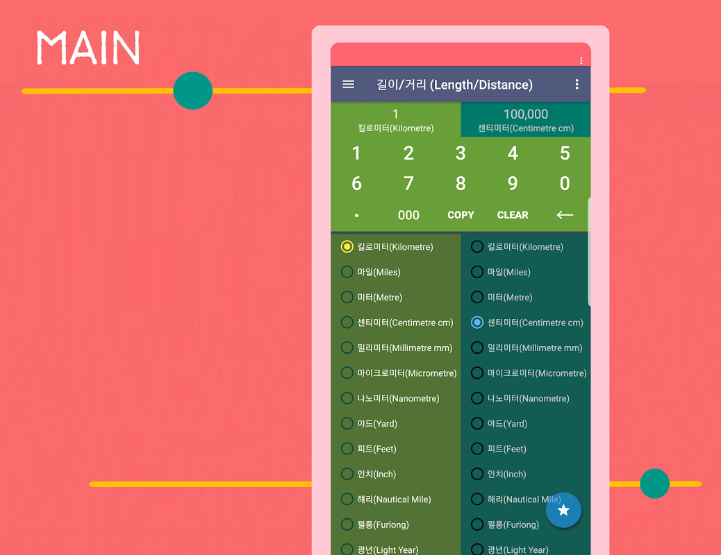 길이,거리,질량,무게,전원,압력,속도,온도,시간,토크,용량,용적,영역,요리,디지털파일,에너지,연료소비,환율등 모든 단위별 수치를 변환 계산 수행