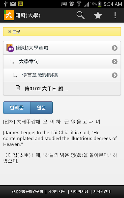 대학(大學) - 전통문화연구회 동양고전 앱 시리즈 중 하나인 대학 입니다. 원문,주석, 언해, 현대어, 영어 번역을 제공합니다.