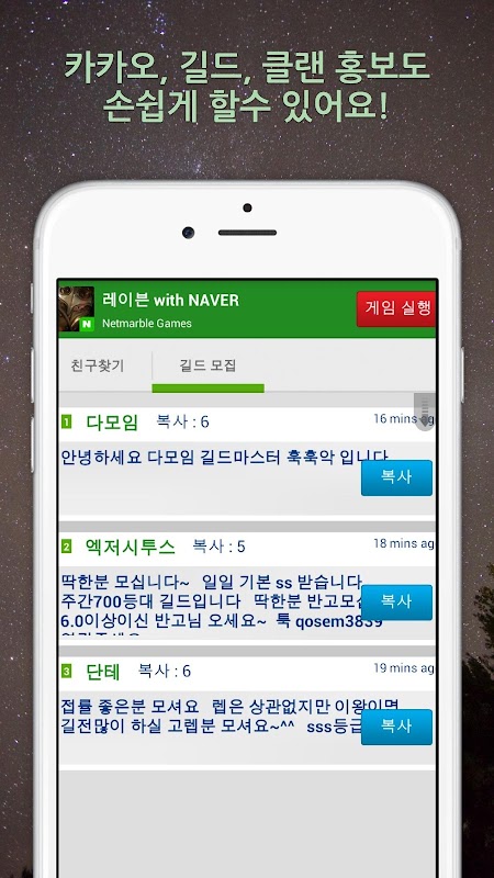 겁나 빠른 레벨업을 위한 필수앱!게임 친구, 길드,클랜 모집과 홍보를 한방에 해결해드립니다! 스팸없고~가짜없고~ 진짜 게이머를 위한 서비스!