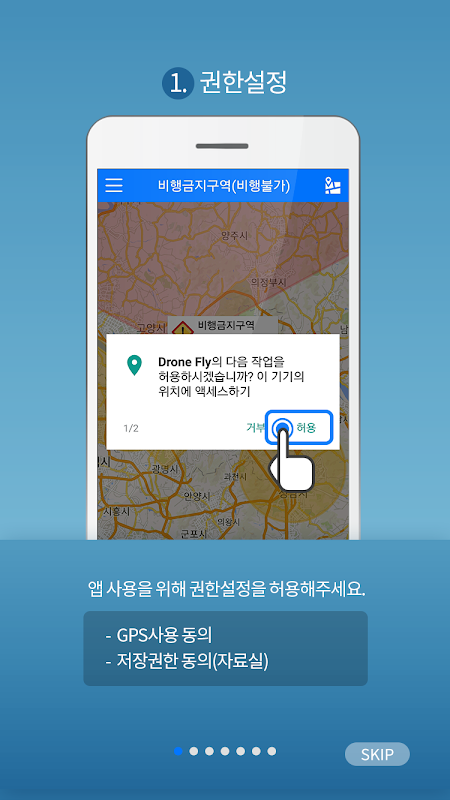 드론플라이에서는 드론안전비행을 위해 국토교통부와 합동참모본부가 제공한 공역정보와 기상청에서 제공한 기상정보를 볼 수 있습니다.