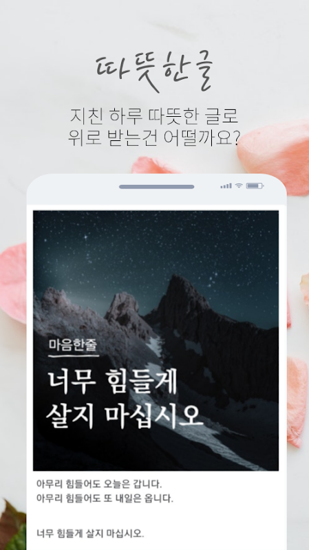마음의 한 줄, 감동을 일으키는 어플! 위로와 힘이 되는 작지만 강한 앱! 당신을 위해 좋은 글만 엄선하여 보내드릴게요