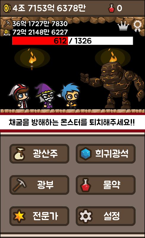 한 탭, 한 탭 클릭 할 때마다 힘쎄고 강해지는 광산주님을 느끼실 수 있습니다.