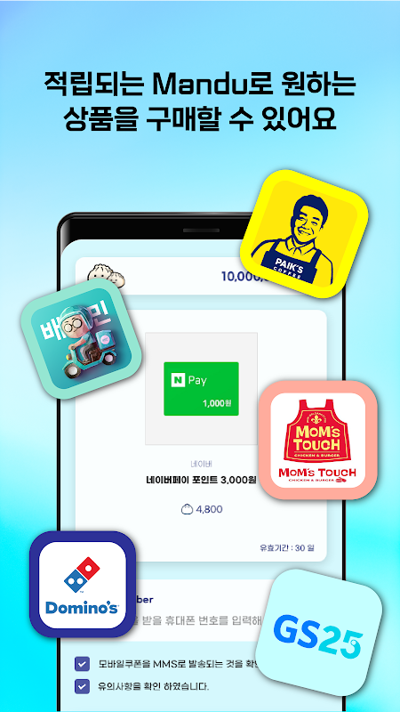 Anda boleh menukar sijil hadiah untuk pelbagai jumlah seperti Naver Pay, Happy Money, dan Baedal Minjok, serta ikon hadiah dari pelbagai kedai gabungan yang boleh digunakan dalam talian dan luar talian, seperti GS25, Mega Coffee, Baekdabang, Mom's Touch, BBQ , dan Domina Pizza.
