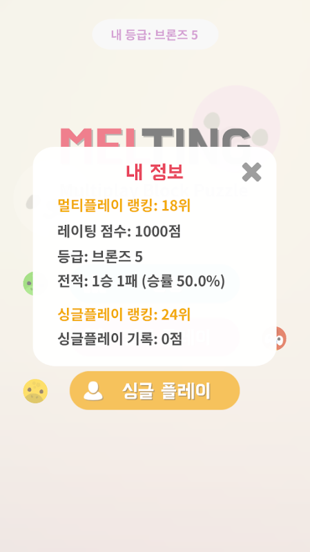 멜팅(MELTING)의 간단한 조작으로 즐길 수 있는 블록 퍼즐 게임(Block puzzle Game)입니다. 조작 방법을 잘 모르시겠다고요? 싱글 플레이를 시작해보세요! 친절한 튜토리얼이 여러분을 기다리고 있습니다. :)