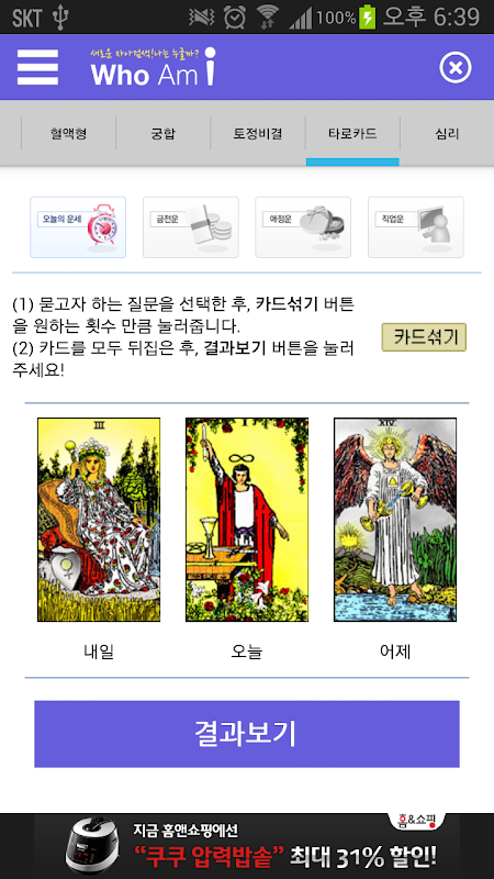 * Who Am I? ㅣ 후엠아이 서비스는 점성술,사주,궁합,토정비결,타로 등의 다양한 운세 로직을 활용하여 누구나 쉽고 편리하게 자신의 성격 및 운세 등을 풀어볼 수 있고, 오늘의 운세를 매일 정해진 시각에 푸시메시지를 통해 받아 볼 수 있는 고품격 개인화 검색 서비스입니다.