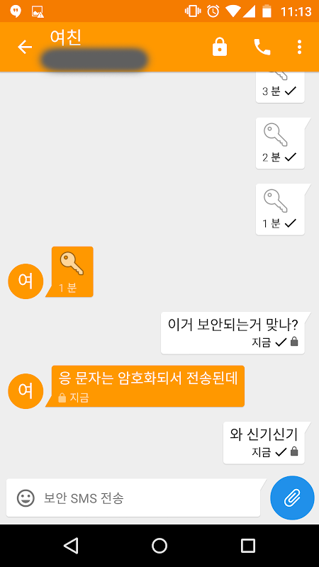 비밀문자를 사용해 사생활이 완전히 보호된 방법으로 SMS 메세지, 미디어, 첨부 파일을 보낼 수 있습니다.