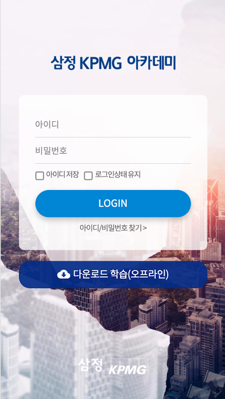PC환경의 삼정 KPMG 아카데미 (http://kpmgacademy.hunet.co.kr/)의 아이디와 비밀번호로 로그인 가능하며, 교육과정 안내/신청, 나의 강의실 등 주요 서비스를 본 모바일 앱에서도 사용하실 수 있습니다.