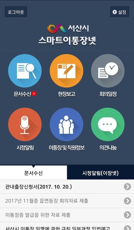 서산시청과 각 마을 이통장님들이 문서,알림,회의,담당자 등의 행정정보를 PC 또는 모바일에서 확인할 수 있는 서산시 모바일 이통장넷입니다.
