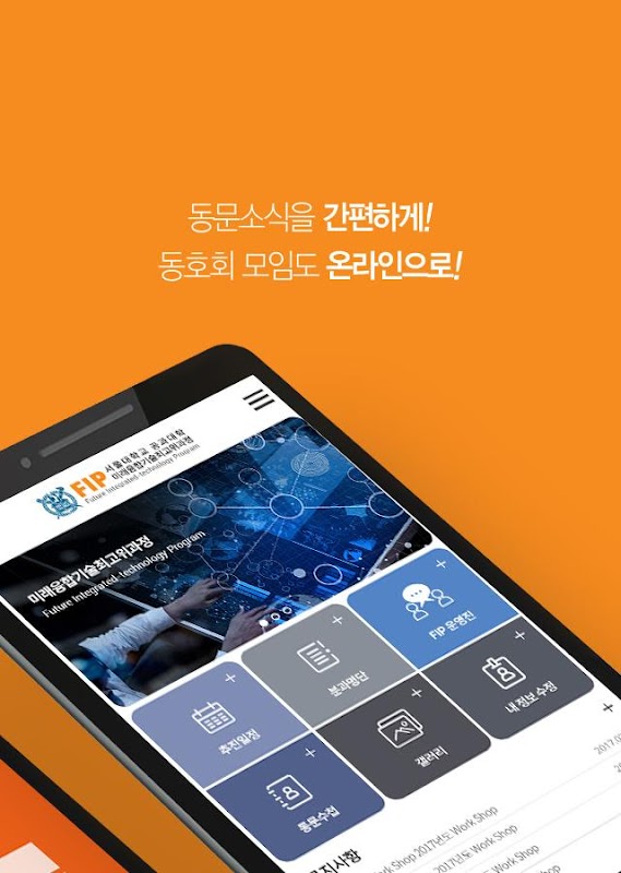 서울대미래융합기술최고위과정(FIP) 동문을 위한 모바일수첩입니다. FIP과정 수강중인 원우,수료한 동문,교수 및 직원,조교만 이용 가능합니다.