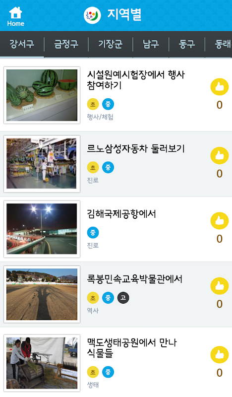부산시내의 주요 체험 활동지 100여곳을 16개의 지역별, 6개의 영역별로 나누어 제공하였습니다.