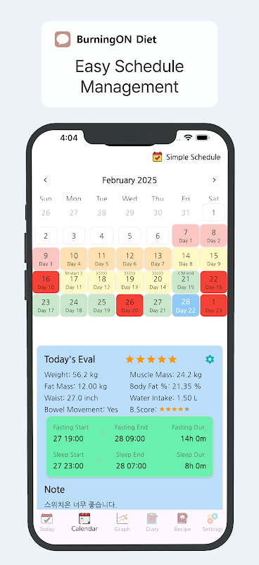 Easily track meal plans, weight, InBody data, water intake, fasting timer, progress photos, and personal notes—all in one place.