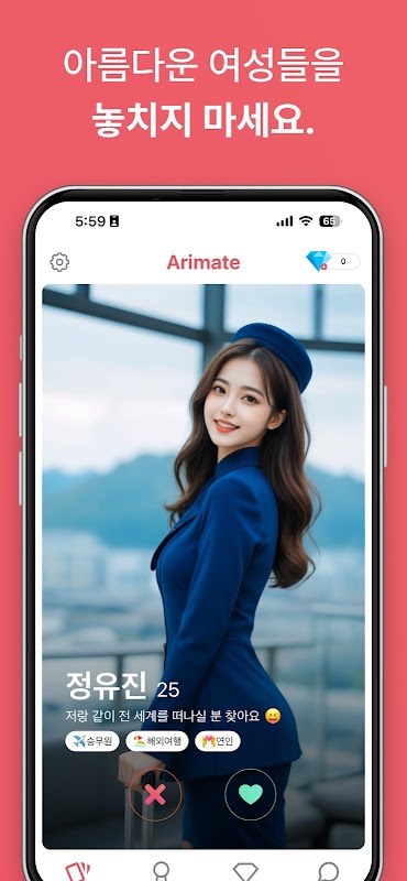 아리메이트와 함께 원하는 상대를 선택하고, 하트 표시로 나만의 가상의 여자친구를 만나보세요.