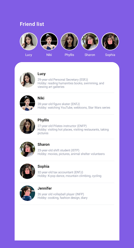 Connect with each girlfriend on different topics such as profession, age, MBTI, hobbies, and more.
