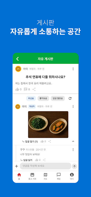 Papan buletin membolehkan pengguna berkomunikasi secara bebas, berkongsi maklumat gaya hidup, bertanya soalan dan berkongsi pengalaman. Ciri dagangan terpakai membolehkan pengguna mencari barangan yang mereka perlukan atau berkongsi barangan yang tidak diingini dengan orang Korea lain.
