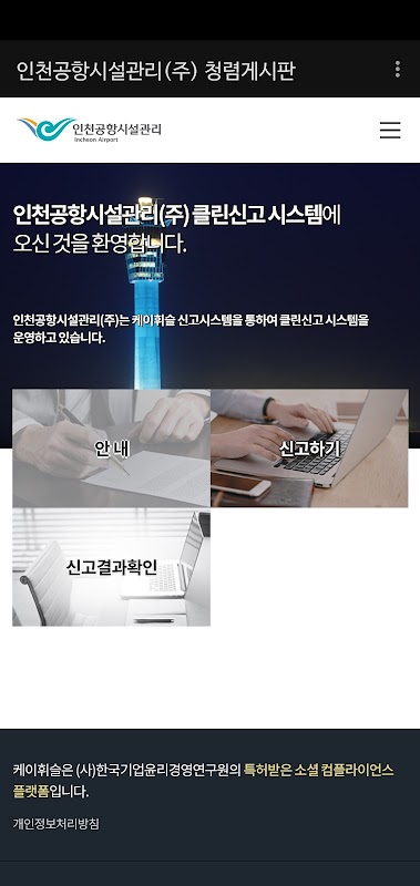 Lembaga Buletin Integriti Incheon Airport Facility Management Co., Ltd. ialah APP yang membenarkan pekerja dalaman atau pihak berkepentingan luar melaporkan rasuah dengan yakin.