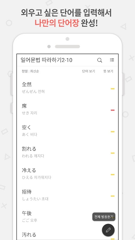 일본어 단어장 앱은 내가 외우고 싶은 일본어 단어 만을 모아 단어장으로 만들어 학습할 수 있는 무료 단어장 앱 입니다.