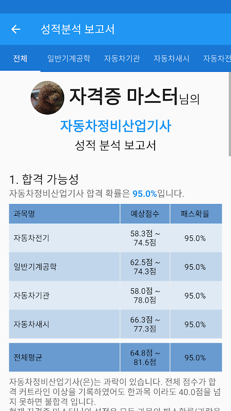 성적확인 - 각 과목별 성적 및 그동안 풀어본 기출문제와 모의고사, 문제풀기의 성적을 볼 수 있습니다.