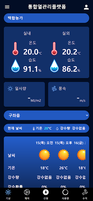 Ia menyediakan suhu dalaman dan luaran untuk rumah ladang, dan anda boleh menyemak cuaca Jeju semasa dan penggunaan kuasa rumah ladang dalam masa nyata.