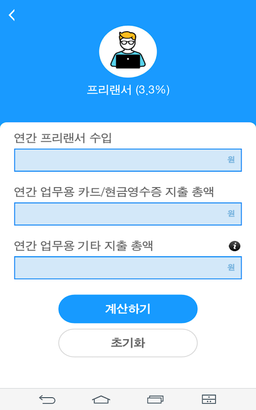 수입(매출)을 입력하고 경비를 입력하면 소득세가 나오는 계산기입니다.